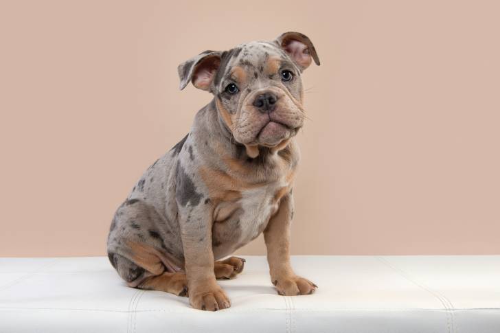 Un chiot Olde English Bulldogge au pelage de différentes nuances de marron et taches brunes est assis.