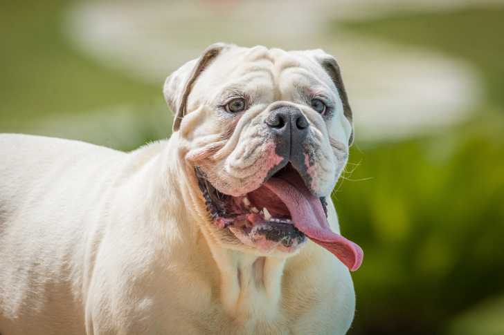 Un Olde English Bulldogge adulte au pelage beige ouvre grand sa bouche et tire la langue.