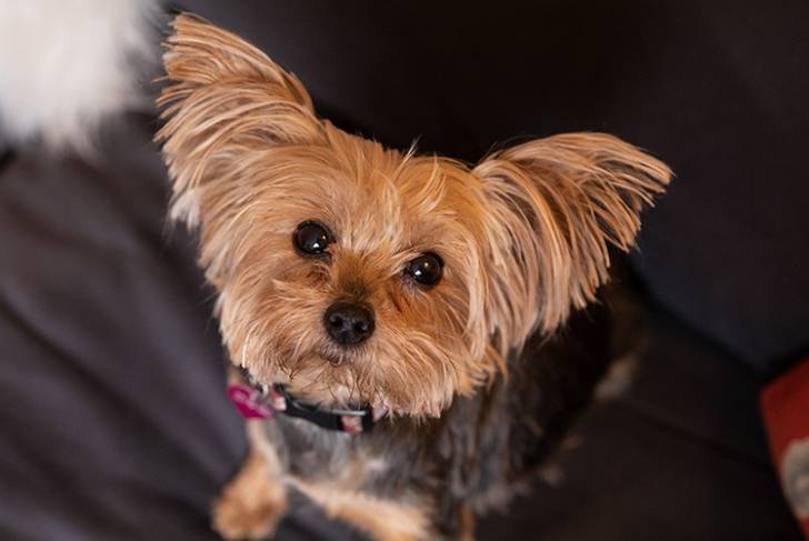 Photo prise de haut d'un Papastzu portant un collier et assis sur un canapé