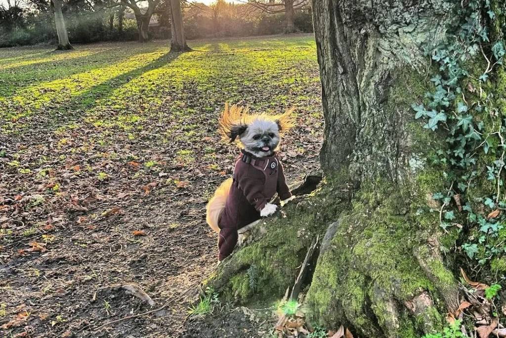 Un Papastzu portant un harnais et debout à côté d'un arbre dans un parc