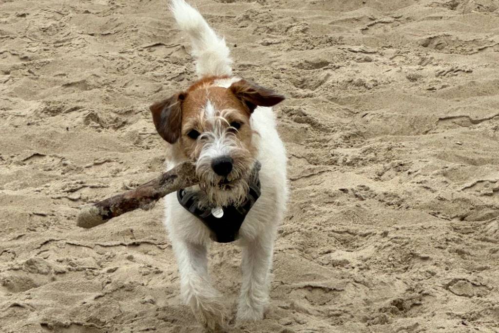 Un Parson Russell Terrier ayant un bâton dans sa gueule et portant un harnais