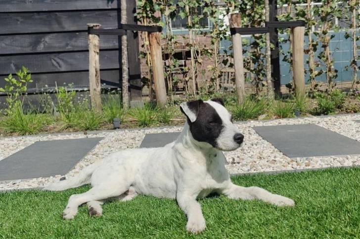 Un Parson Russell Terrier allongé sur une surface gazonnée