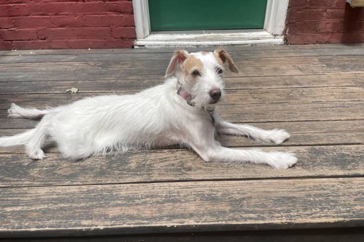 Un Parson Russell Terrier allongé sur un plancher et portant un collier autour du cou