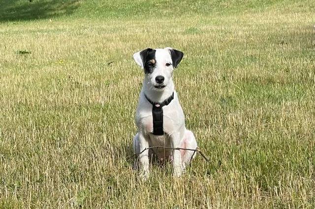 Un Parson Russell Terrier assis sur un terrain herbeux et portant un harnais