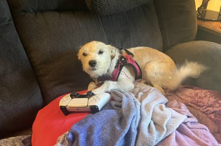 Un Parson Russell Terrier allongé sur un canapé et portant un harnais