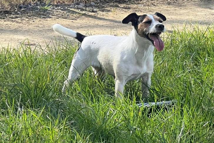 Un Parson Russell Terrier sur une surface herbacée et ayant la langue pendante
