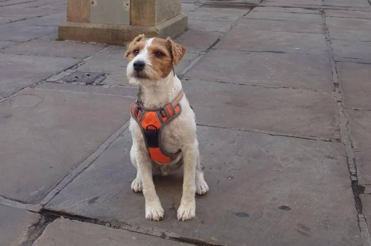 Un Parson Russell Terrier assis sur une surface bétonnée et portant un harnais