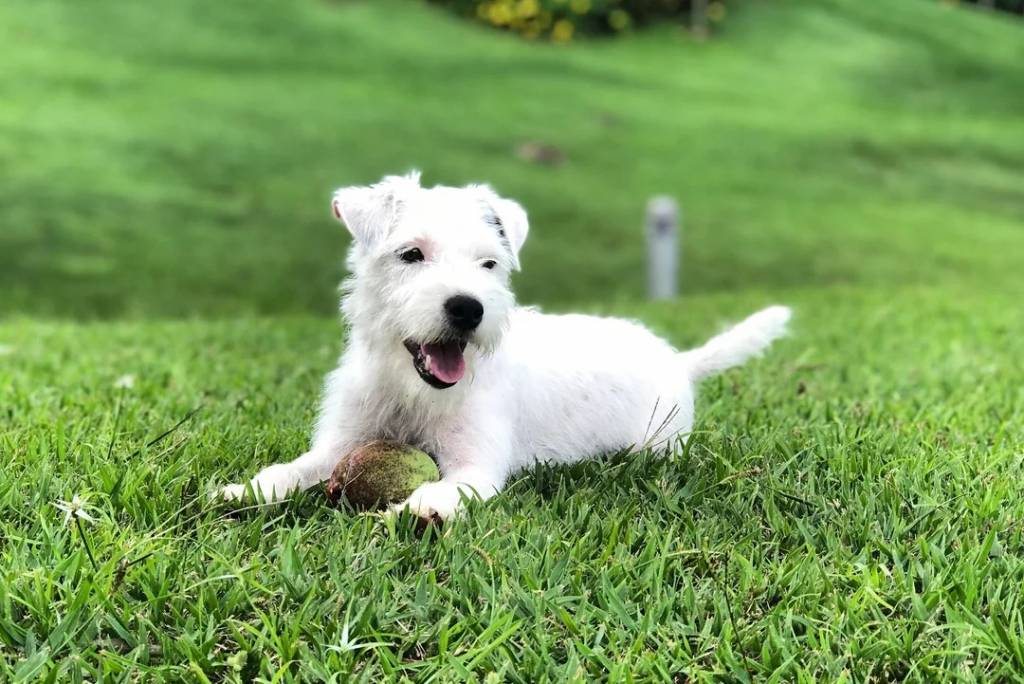 Un Parson Russell Terrier allongé sur une surface gazonnée et ayant la gueule ouverte