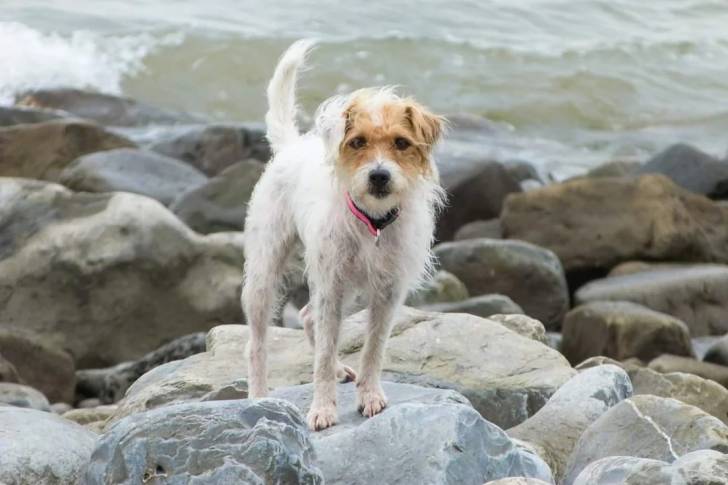Un Parson Russell Terrier regardant vers la caméra et portant un collier autour du cou