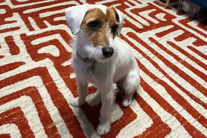 Un Parson Russell Terrier assis sur une moquette et portant un collier autour du cou et portant un collier autour du cou