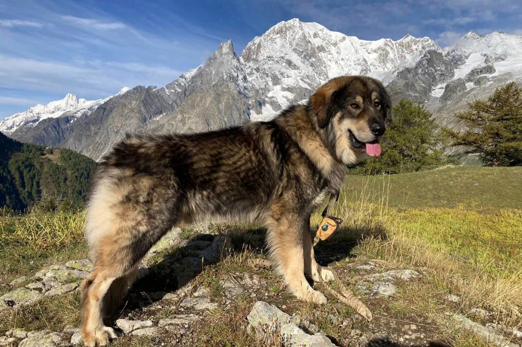 Un Pastore della Sila sur une surface herbacée et tirant la langue