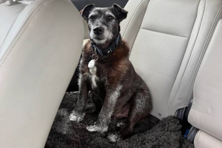 Un Patterdale Terrier assis sur la banquette arrière d'une voiture et portant un collier autour du cou