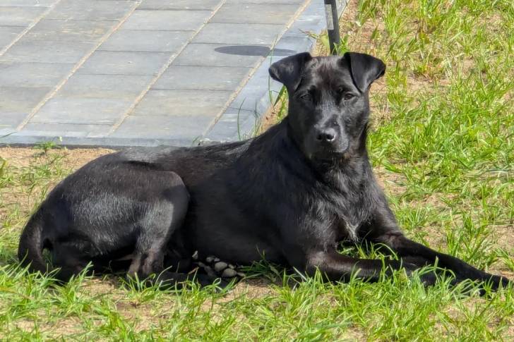 Un Patterdale Terrier allongé sur une surface gazonnée et semblant détendu