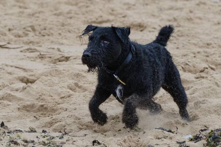 Un Patterdale Terrier courant sur une surface sableuse et portant un collier autour du cou