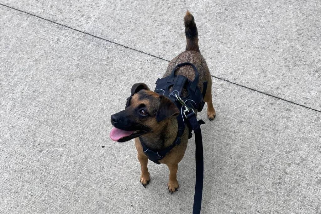 Un Patterdale Terrier sur une surface bétonnée et qui est tenu en laisse