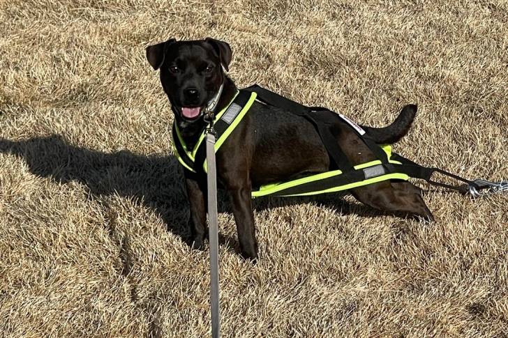 Un Patterdale Terrier tirant la langue et qui est tenu en laisse