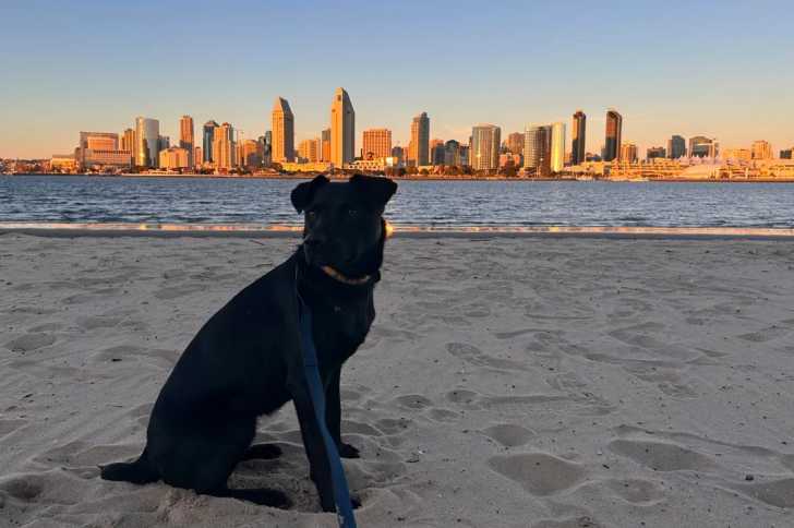 Un Patterdale Terrier assis sur une surface sableuse et qui est tenu en laisse