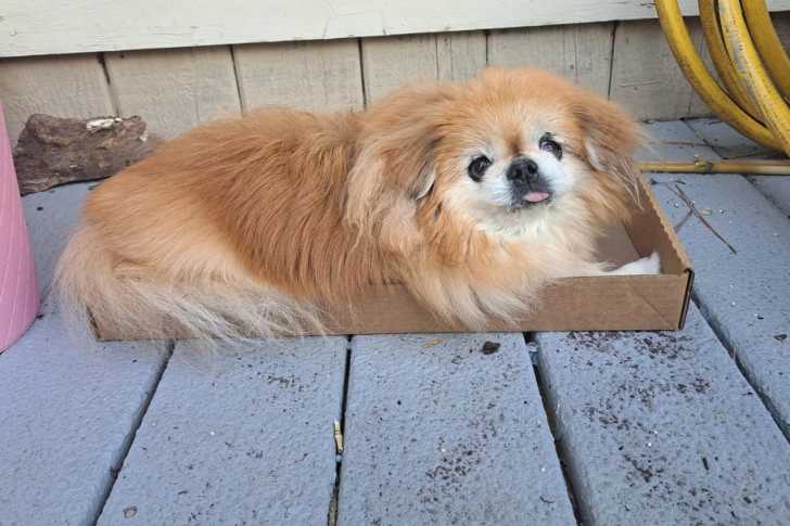 Un Pekalier allongé dans un carton et tirant la langue