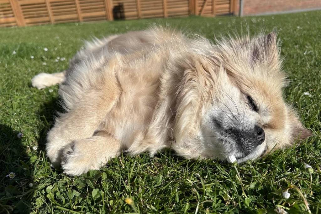 Un Pekalier allongé sur un terrain herbeux et semblant dormir
