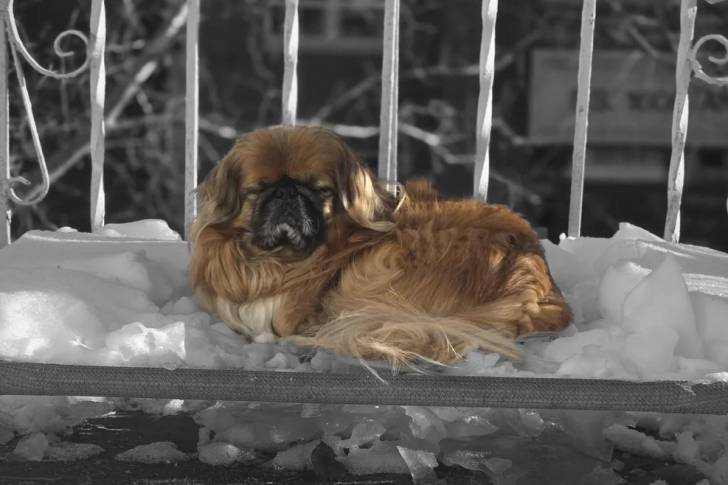 Un Pekalier allongé sur des morceaux de glace et ayant les yeux fermés