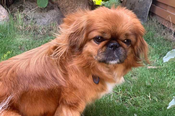 Un Pekalier assis sur un terrain herbeux et portant un collier autour du cou
