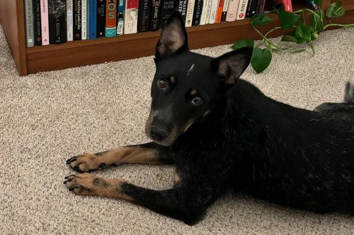 Un Pembroke Kelpie Dog allongé sur une moquette et regardant vers la caméra