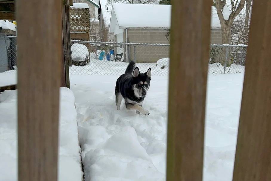 Un Pembroke Kelpie Dog sur une surface enneigée et qui est tenu en laisse
