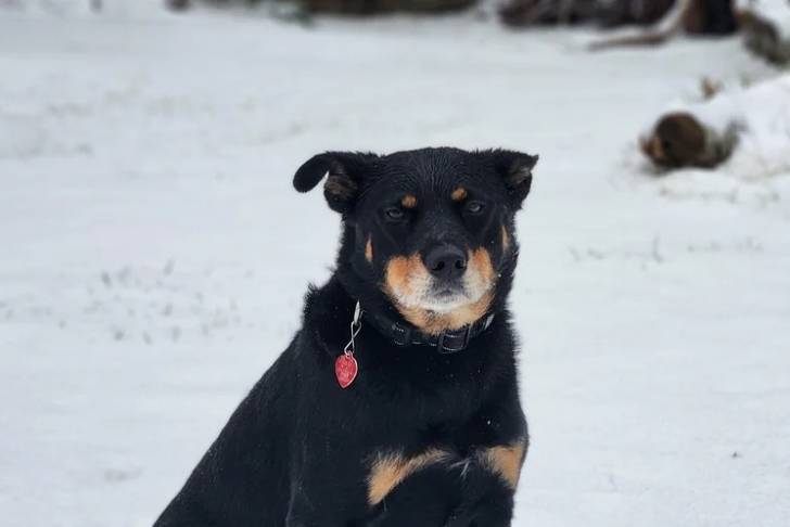 Un Pembroke Kelpie Dog assis sur une surface enneigée et portant un collier autour du cou