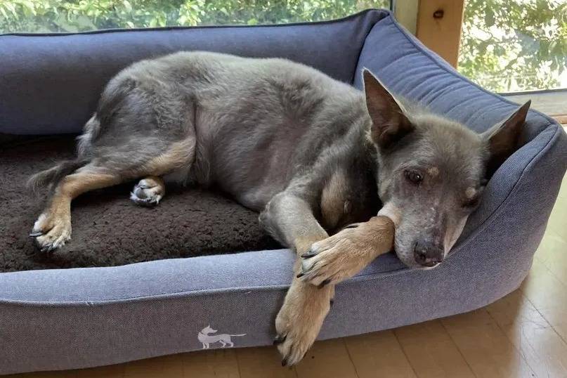 Un Pembroke Kelpie Dog allongé dans un panier et semblant détendu
