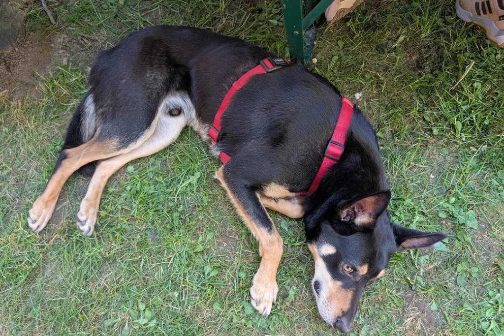 Un Pembroke Kelpie Dog allongé sur une surface herbacée et portant un harnais