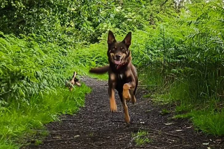 Un Pembroke Kelpie Dog courant dans une allée et tirant la langue