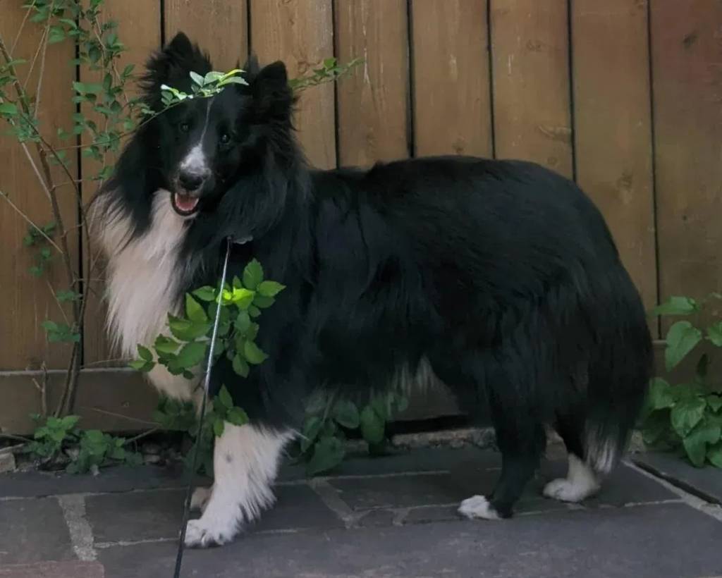 Un Pembroke Sheltie regardant vers la caméra et qui est tenu en laisse