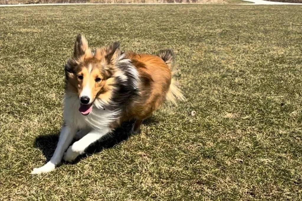 Un Pembroke Sheltie courant sur une surface herbacée et regardant vers la caméra