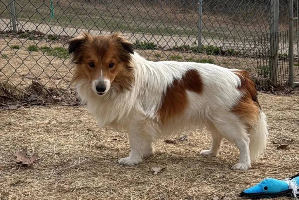 Un chiot Pembroke Sheltie sur un terrain herbeux et regardant vers la caméra