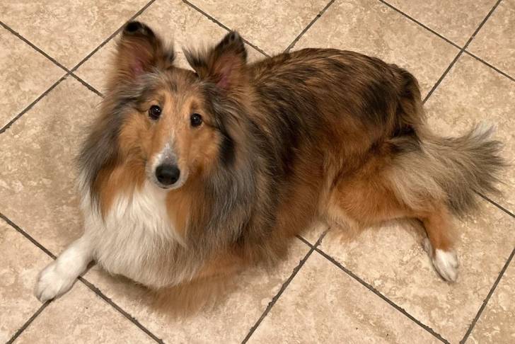 Un Pembroke Sheltie allongé sur un sol carrelé et regardant vers la caméra