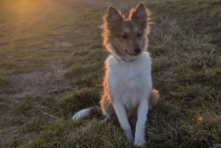 Un Pembroke Sheltie assis sur un terrain herbeux et portant un collier autour du cou