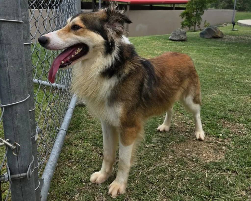 Un Pembroke Sheltie sur un terrain herbeux et ayant la langue pendante