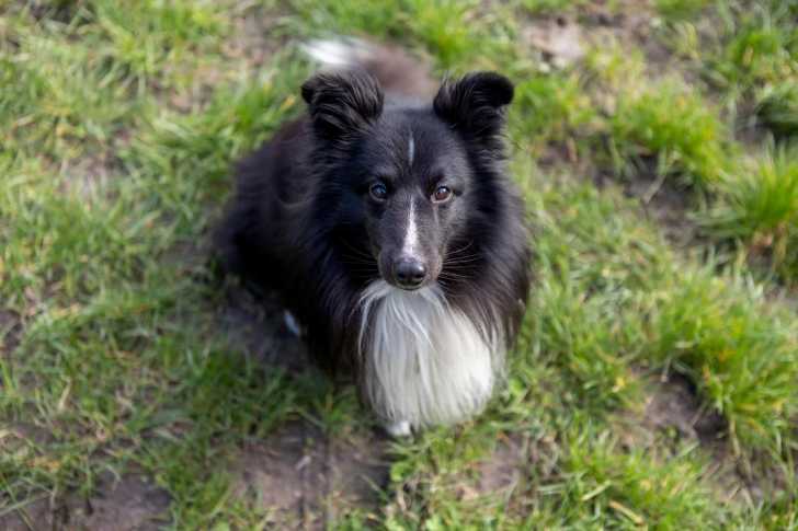 Un Pembroke Sheltie assis sur une surface herbacée et regardant vers la caméra