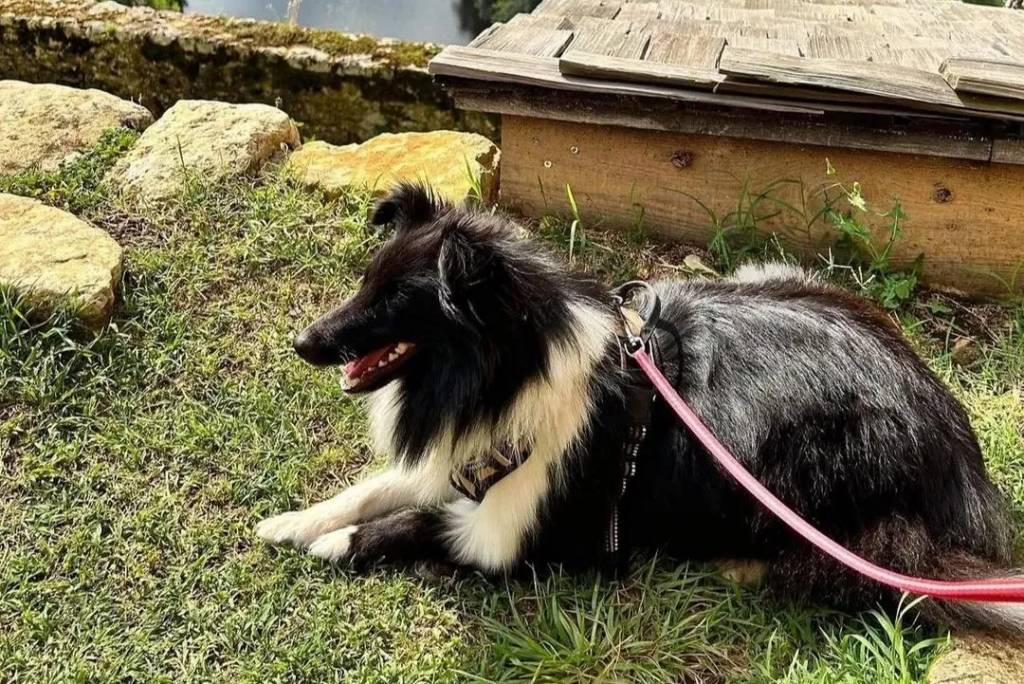 Un Pembroke Sheltie allongé sur un terrain herbeux et qui est tenu en laisse