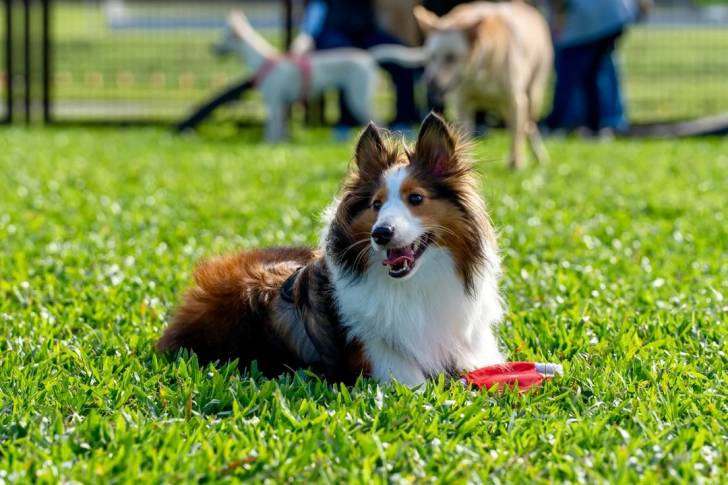 Un Pembroke Sheltie allongé sur une surface herbacée