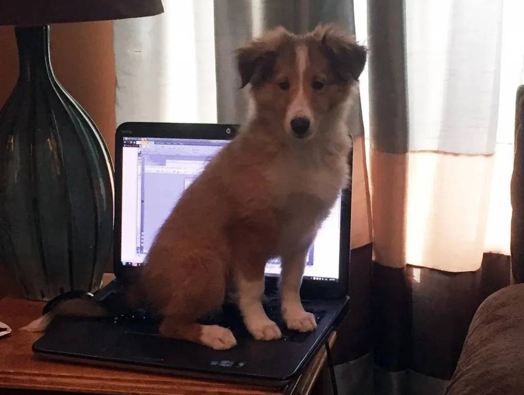 Un Pembroke Sheltie assis sur un ordinateur et semblant détendu