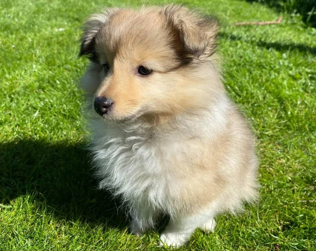 Un chiot Pembroke Sheltie assis sur un terrain herbeux