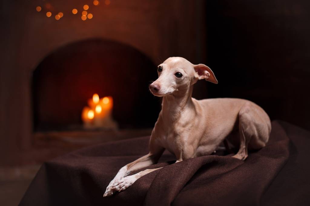 Un Petit Lévrier Italien allongé près d'une cheminée