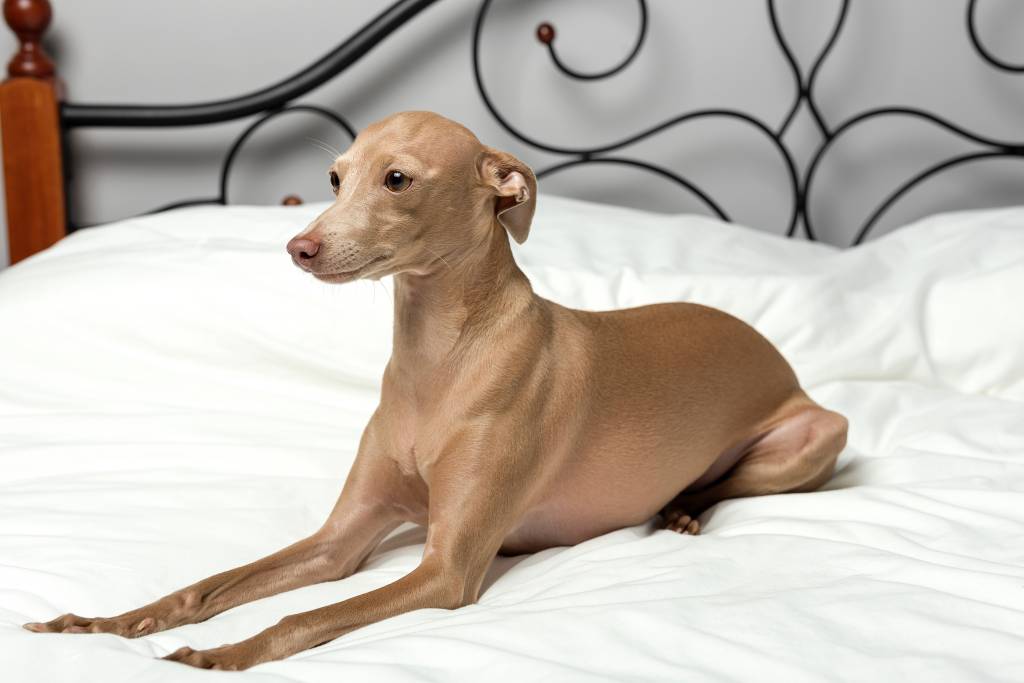 Un Petit Lévrier Italien allongé sur un lit en fer forgé