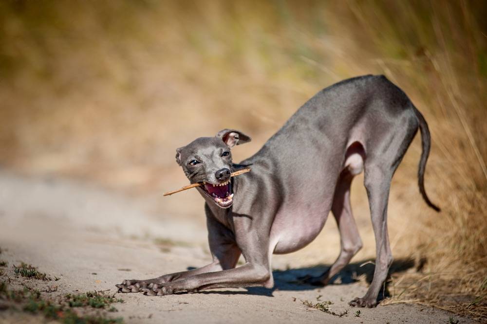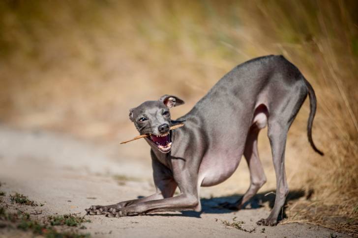 Un Petit Lévrier Italien en train de s'étirer avec un bâton dans la gueule
