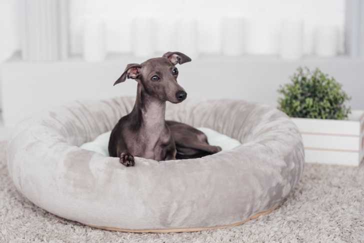 Un Petit Lévrier Italien allongé dans son panier à son domicile