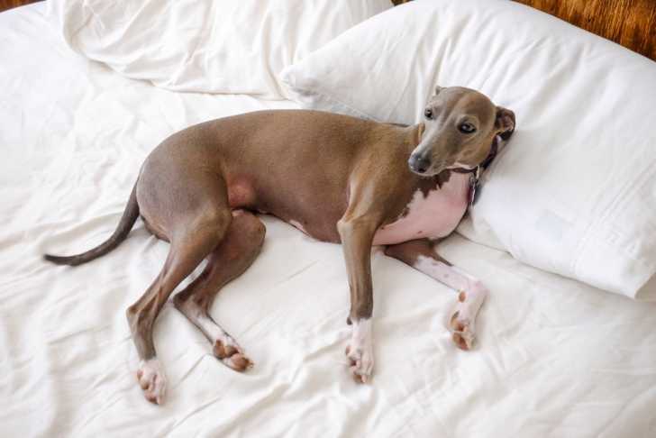 Un Petit Lévrier Italien allongé dans un lit