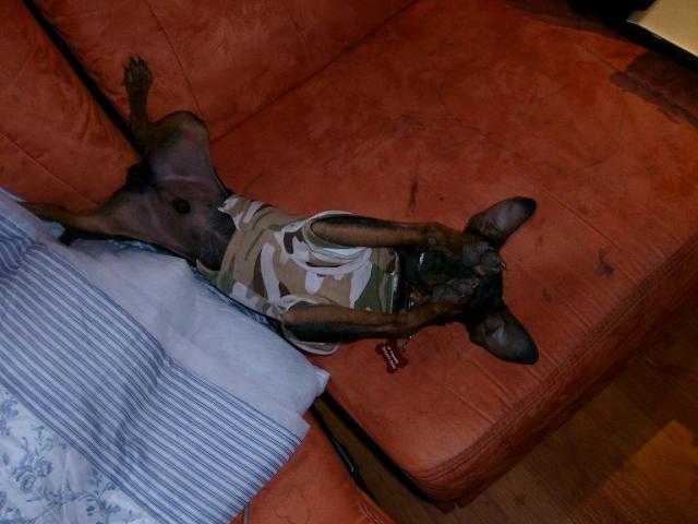 il est trop fatigué mon chien-chien...il est étaler sur son canapé qui comme vous voyez a pris un sacré coup de vieux depuis que monsieur l a pris comme lit!! o