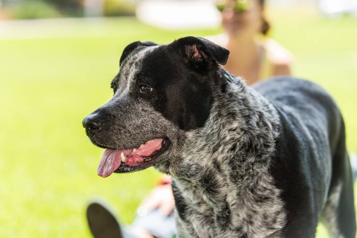 Un jeune Pit Heeler se balade avec son maître