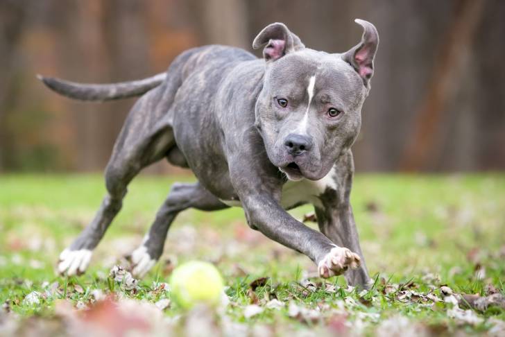Un chiot Pitbull joue à aller chercher une balle de tennis